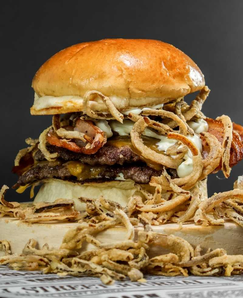 Doble smash Burger de 90g cada, bacón Ahumado, doble queso cheddar, coronada con nuestra cebolla frita crujiente y un toque de salsa BBQ