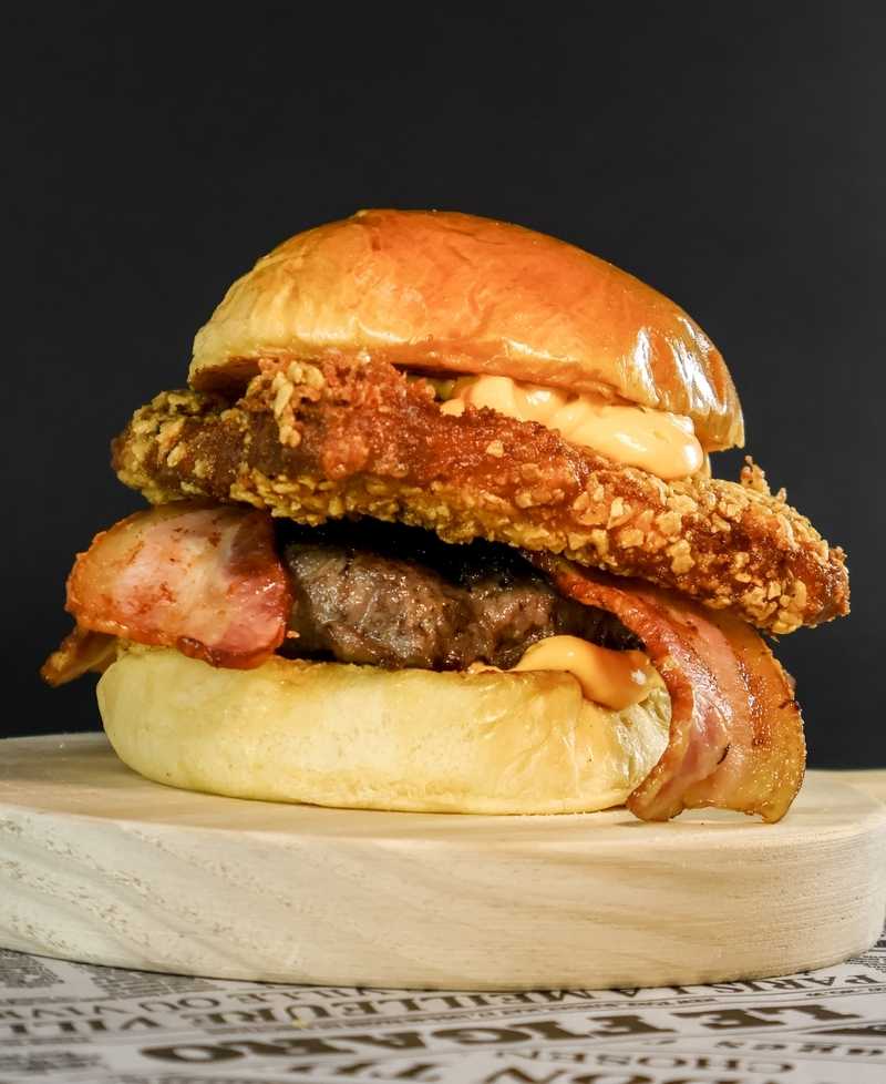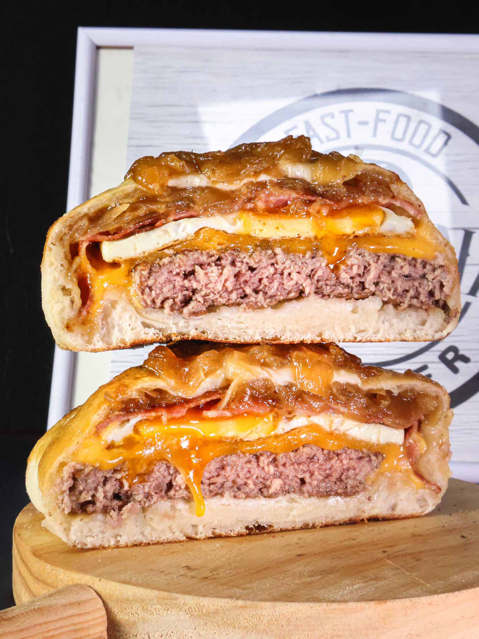 Doble smash jugoso de blend de ternera, doble cheddar, bacón crujiente, cebolla caramelizada y un huevo frito que lo une todo en una explosión de sabor